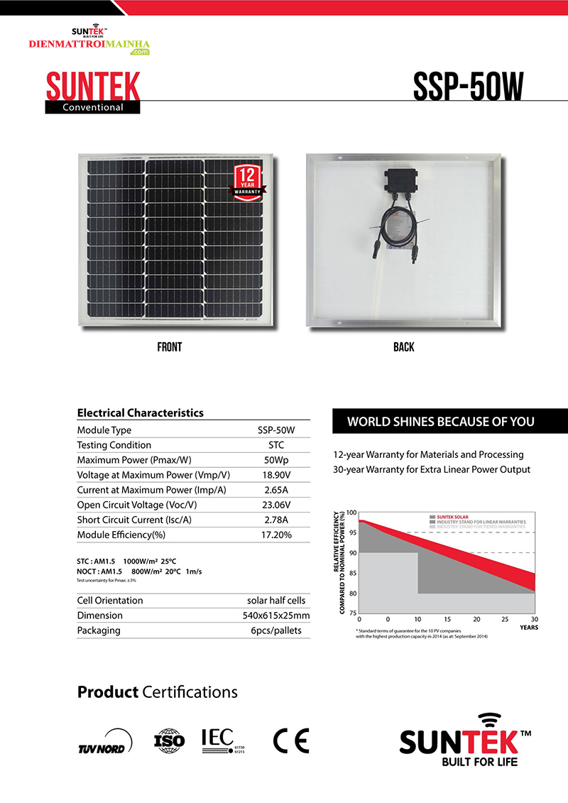 + Tấm Pin Năng Lượng Mặt Trời SUNTEK SSP-50W không những áp dụng công nghệ mới để cải thiện hiệu quả của các modun mà còn mang lại vẻ ngoài thẩm mỹ tốt hơn, hoàn hảo cho việc lắp đặt.